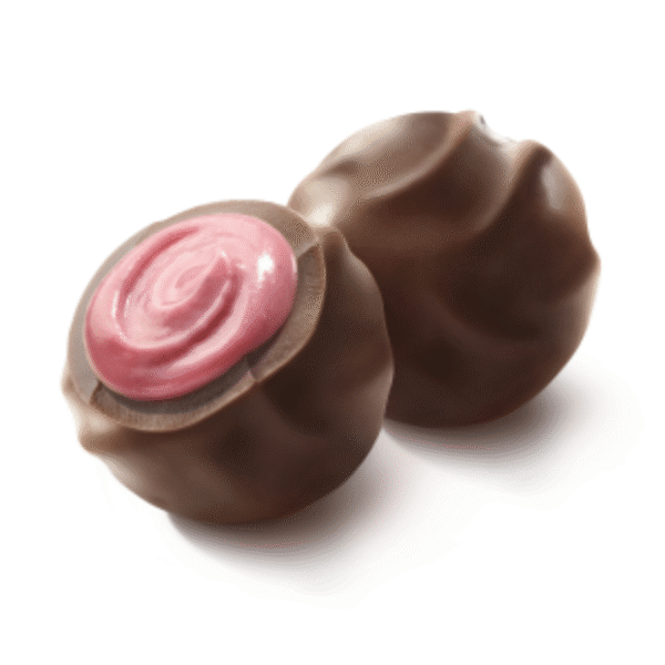 Ingredienser: Sukker, kakaomasse, vegetabilske oljer (palme, shea), skummet MELKEpulver, kondensert MELK, kakaosmør, glukose-fruktosesirup, kirsebærpuré, hel MELKEpulver, emulgator (SOYA-lecitin), aromaer, etylalkohol, ekstrakt av rødbetesaft. Kan inneholde spor av NØTTER og GLUTEN.